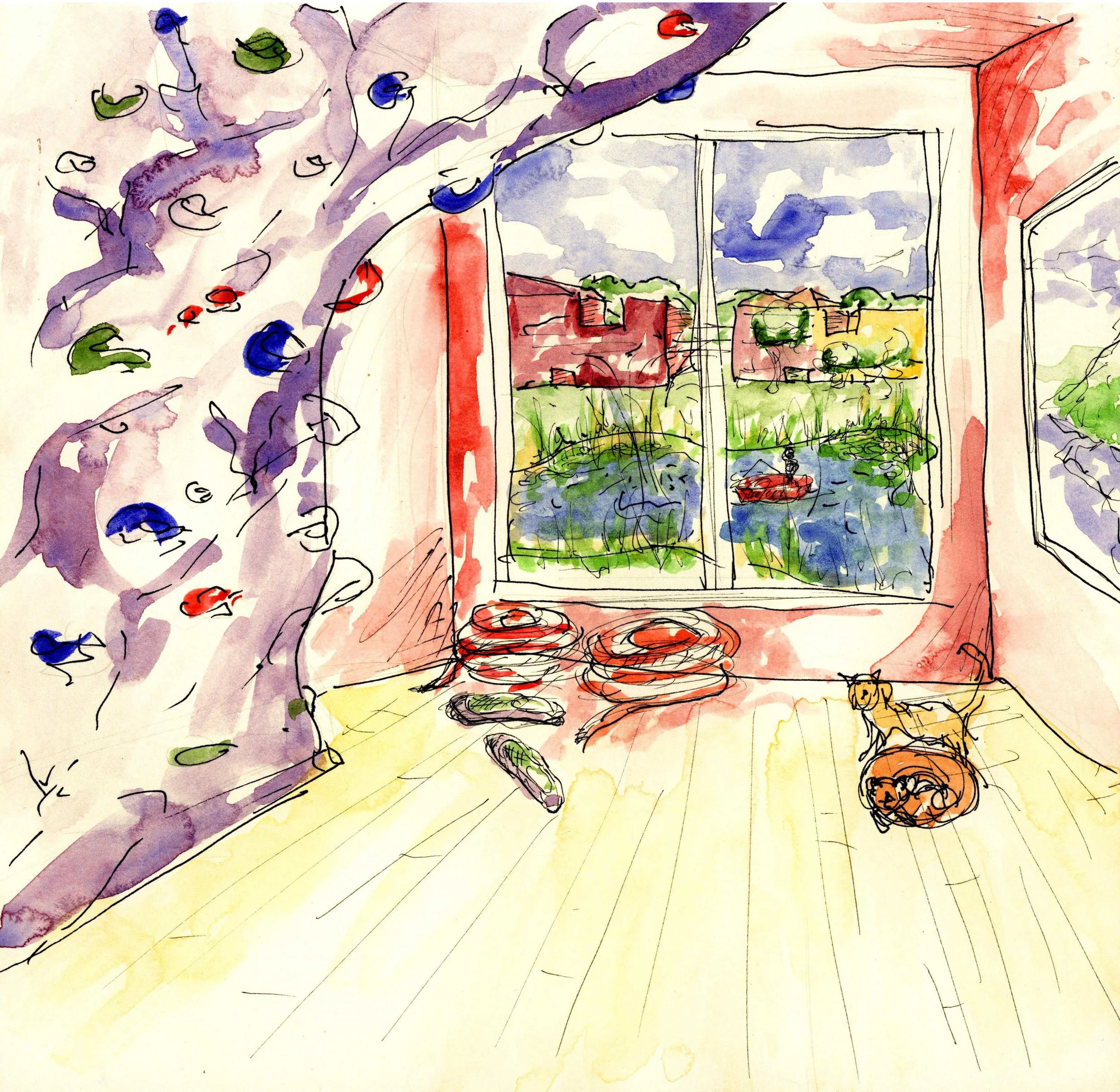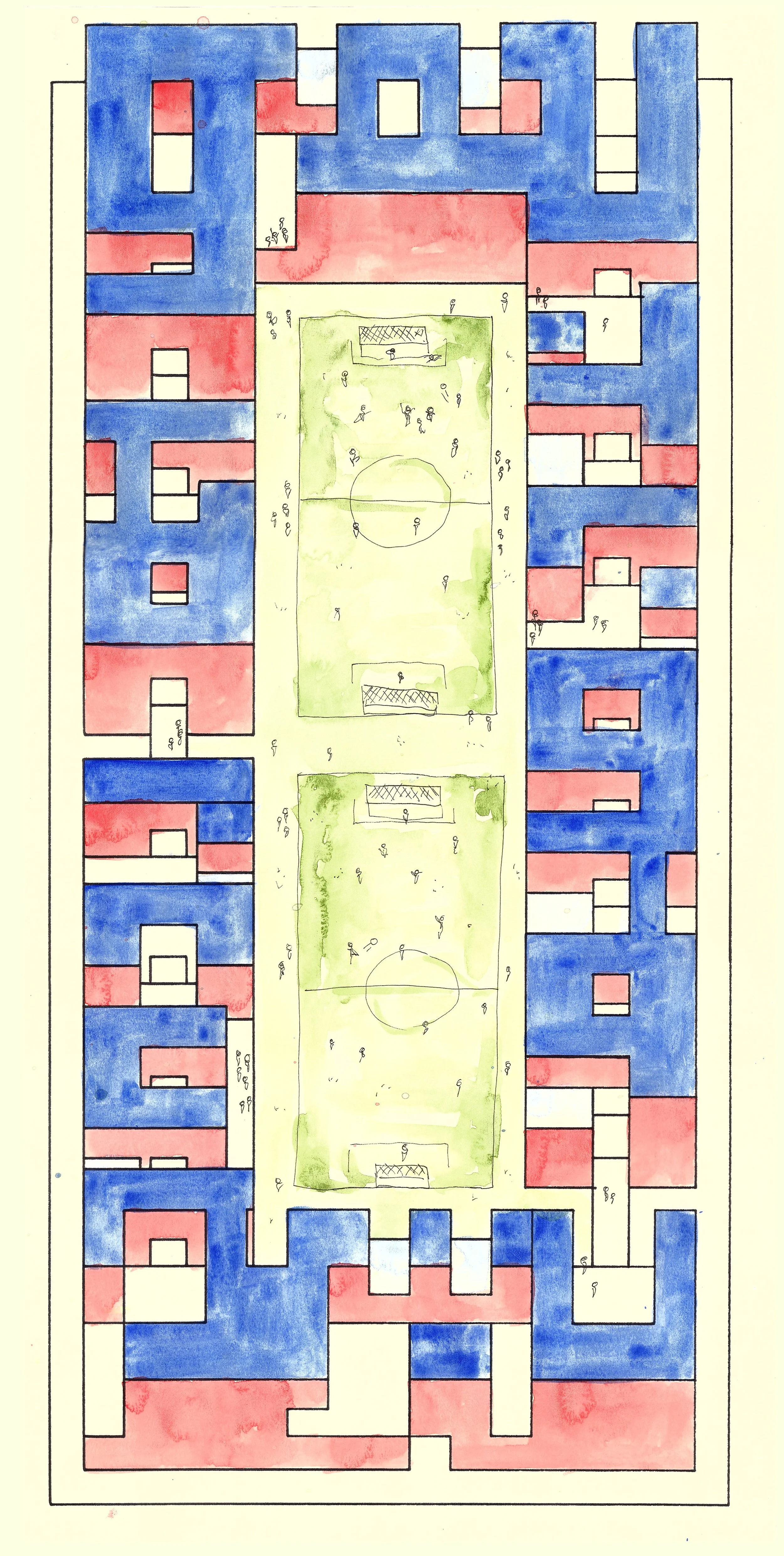 A note on the drawings: all of the blocks were drawn using a CNC mill fit with a felt tip pen, from there on they were watercolored by hand. Ultimately the display was 7' by 7' of drawn material. They were drawn in a 90 degree isometric projection, showing only one side and the tops of the buildings.