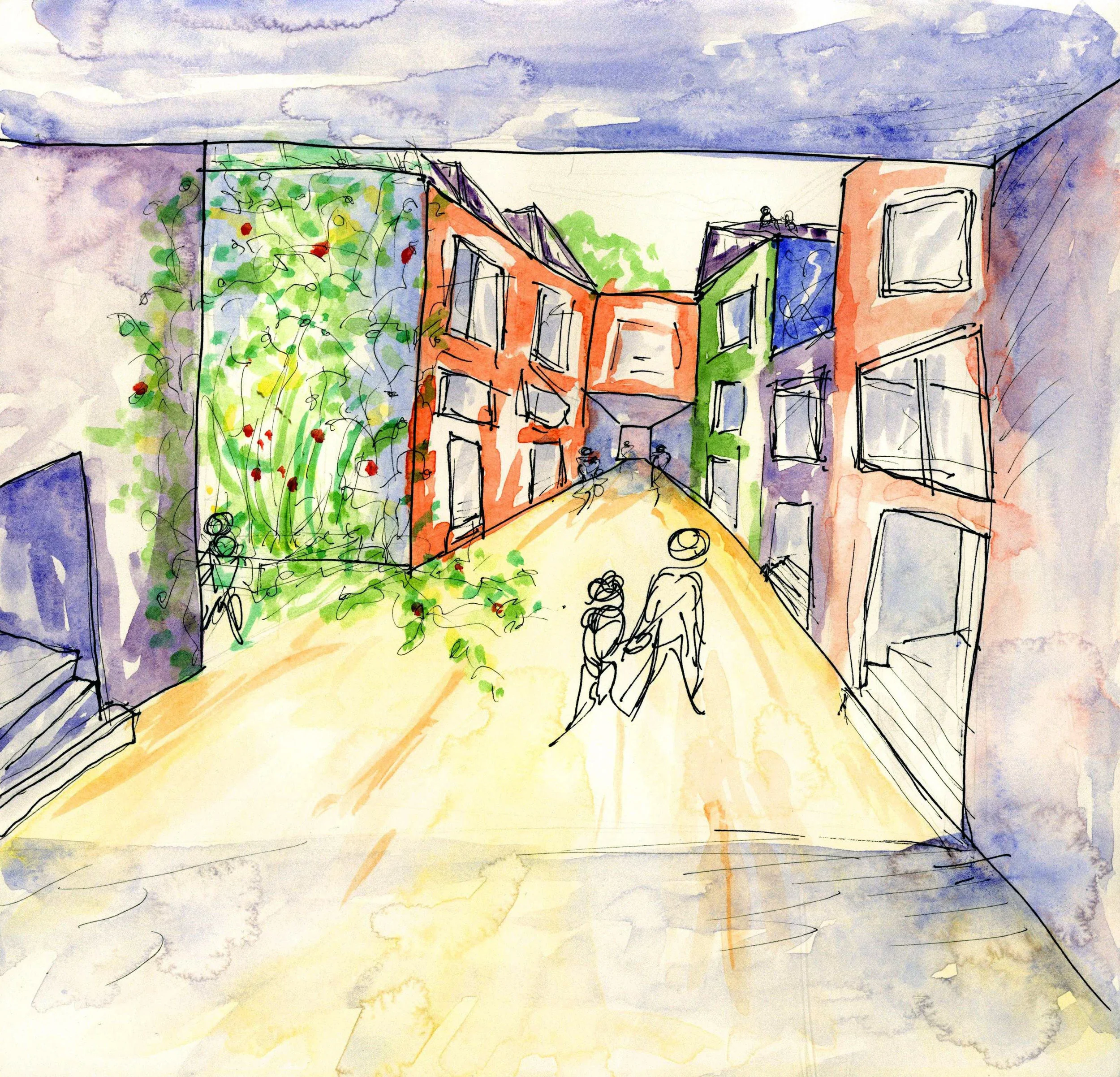 Keeping the 8th by 16th mile division of the blocks we decided to see what would happen if we pooled the total needs of the block: individual dumpsters would go to single trash pick up buildings; access paths which take 3' from each building's width would become generous avenues through the block; split back yards would become generous walled green space. Borrowing a note from Le Corbusier we were able to add a center hall into the building mass which brings light, but also protection from harsh winters. All of this with the same square footage as Chicagoans currently enjoy in their homes.